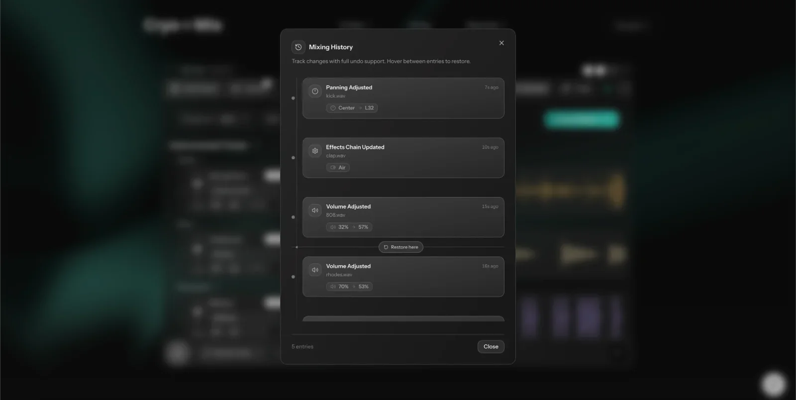 Made a change and preferred the older version? Inside your project, click "History" and restore any previous state in seconds. No more second-guessing edits. Your project history is also persistently saved, so you can close your session, come back days later, and still restore older versions of your mix.